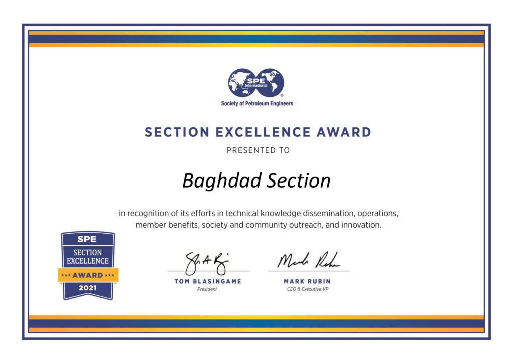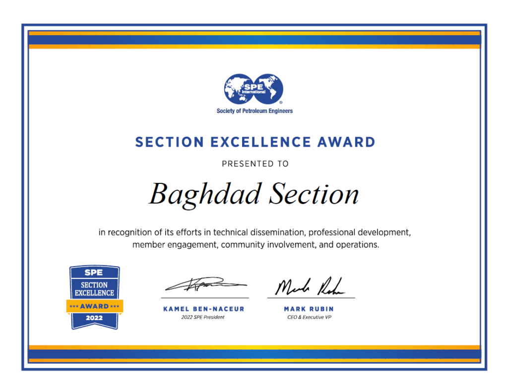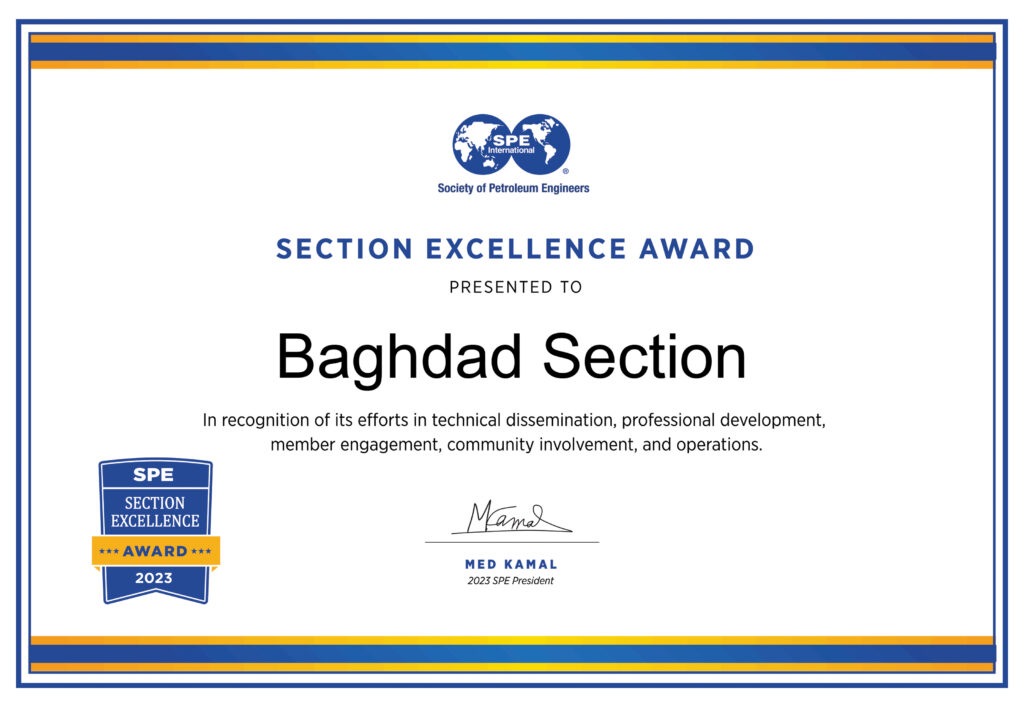 Since its establishment in 2015, the SPE Central Iraq Section (formerly SPE Baghdad Section) has been awarded the Section Excellence Award in 2021, 2022, and 2023 by SPE International for its activities and excellence.